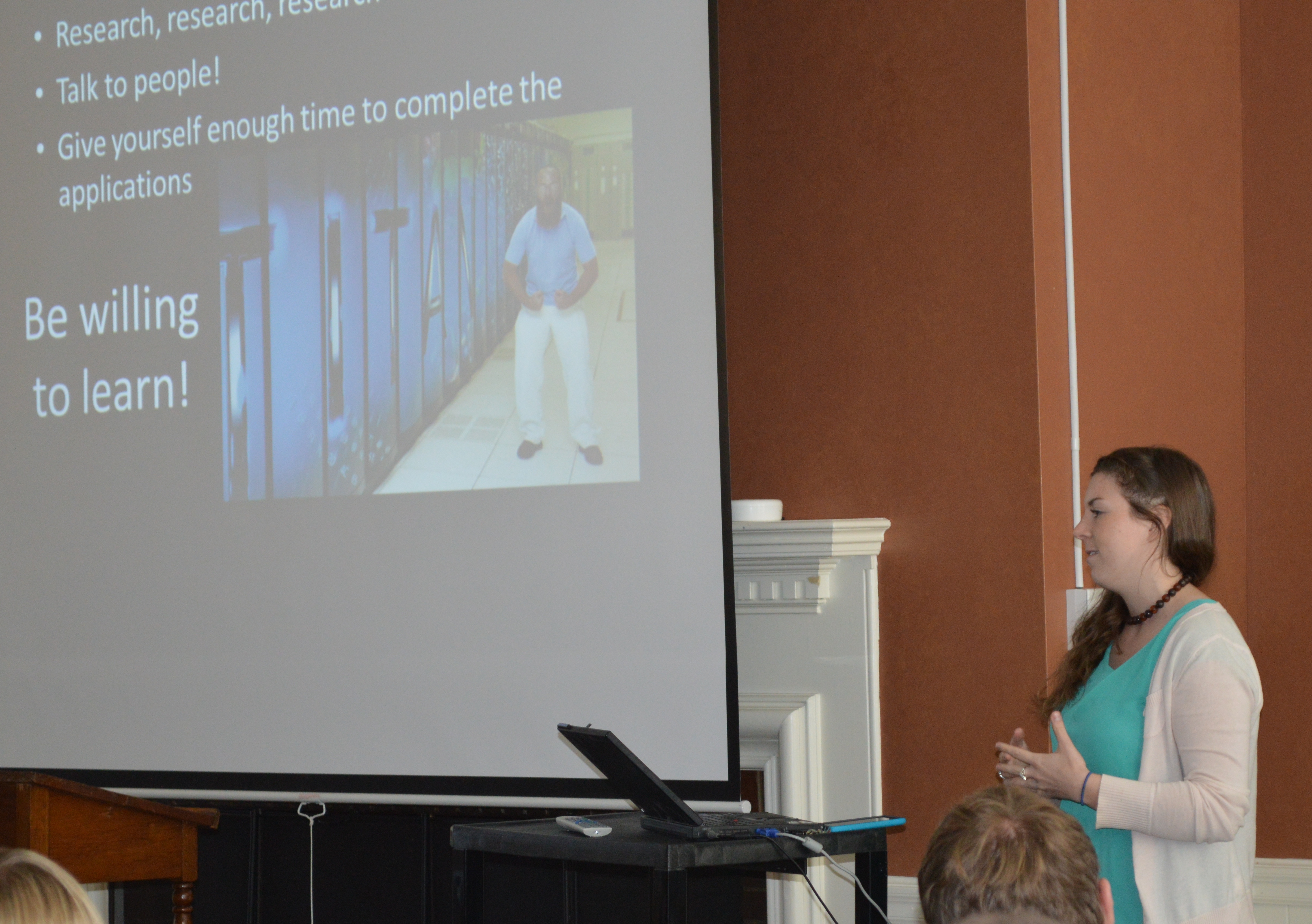 The first presenter was Hannah Fry, a senior math major and physics minor who spent the summer working on environmental modeling at the Oak Ridge National Lab. Hannah’s project required her to stretch her programming skills to fill as she worked on satellite image data. As satellites collect data around the globe, scientists are using the images to make inferences about what kinds of environmental changes are occurring at various locations. Hannah’s job was to fill in the ‘gaps’ in the data caused by obstructed views or other interruptions. She applied two different interpolation methods to eight years of data on the state of Ohio to analyze the differences between them. Hannah’s advice to students was to put themselves out there and not be afraid to take on the challenge of an internship at the labs because the experience was such a valuable educational and vocational one for her.